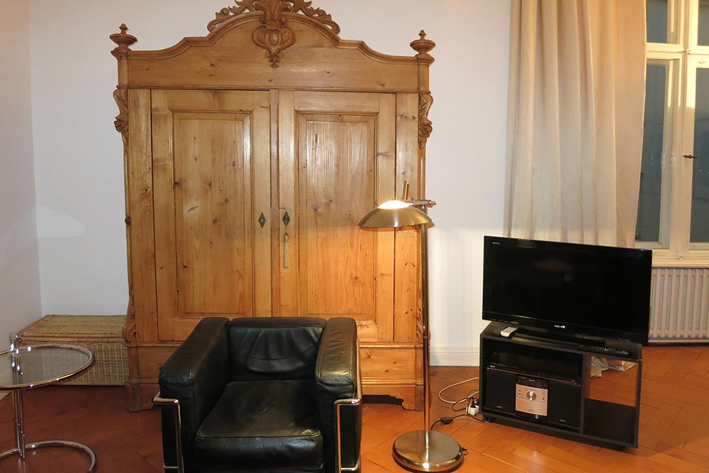 Die helle, absolut ruhige Wohnung verfügt über eine moderne Einrichtung, die kombiniert wurde mit Designermöbeln und Antiquitäten. Aufteilung: Wohnzimmer mit Essbereich, Schlafzimmer mit Doppelbett 1,60 x 2,00, Wohnküche mit Essplatz, Spül- und Waschmaschine, Wannenbad mit integrierter Dusche. Parkett- und Dielenboden, Kabelanschluss, Flat Screen TV-Gerät, Stereoanlage, DVD-Player, DSL-Anschluss. Die komplette Einrichtung kann zusätzlich erworben werden. Keller vorhanden.